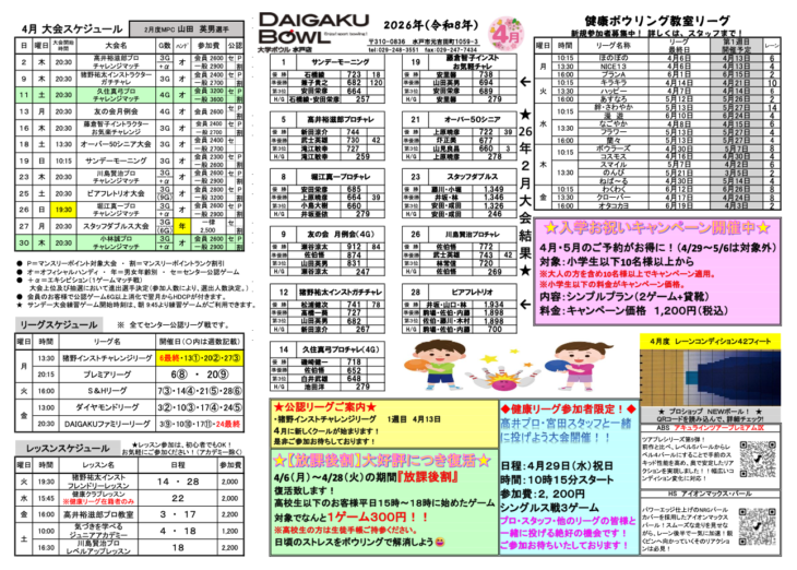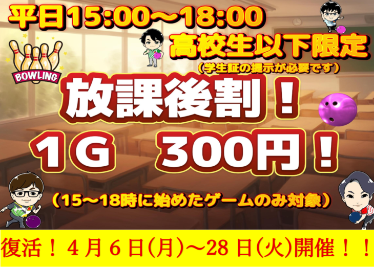 大学ボウル水戸店 イベント告知「予告!!放課後割4月6日開催」